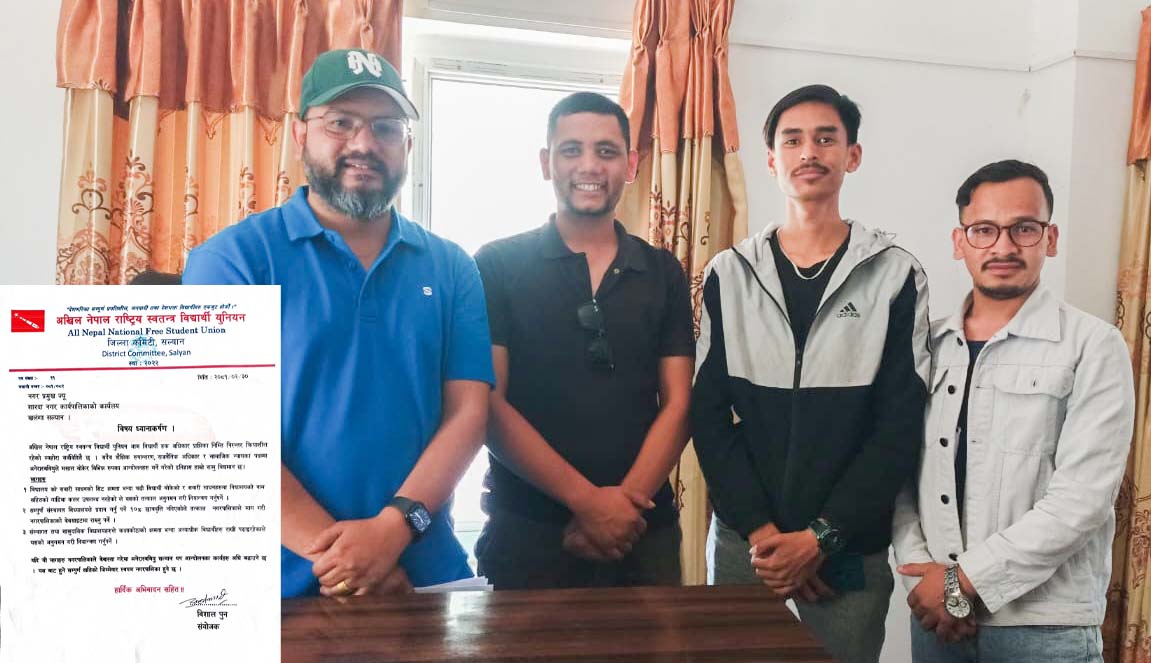बुधबार अनेरास्ववियुका कर्णाली प्रदेश अध्यक्ष राजेश वली र सल्यान जिल्ला अध्यक्ष विशाल पुनमगरले शारदा नगरपालिका प्रमुख प्रकाश भण्डारीलाइ विद्यार्थीहरुका मुद्दा उठाउँदै ध्यानाकर्षण पत्र बुझाएका हुन् ।