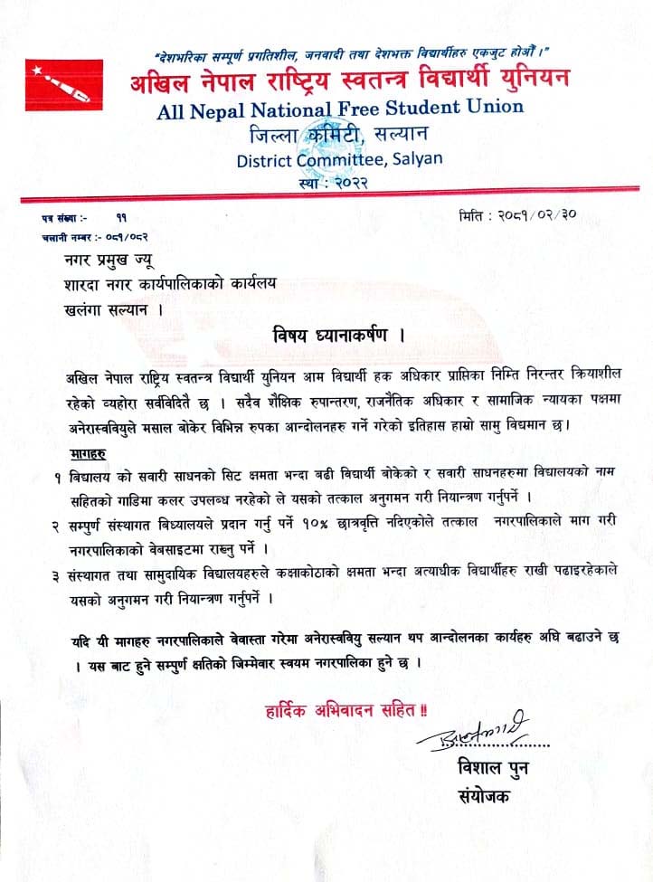अखिल नेपाल राष्ट्रिय स्वतन्त्र विद्यार्थी युनियन सल्यानले शारदा नगरपालिकालाइ ३ बुँदे माग सहितकाे ध्यानाकर्षण पत्र बुझाएकाे छ ।