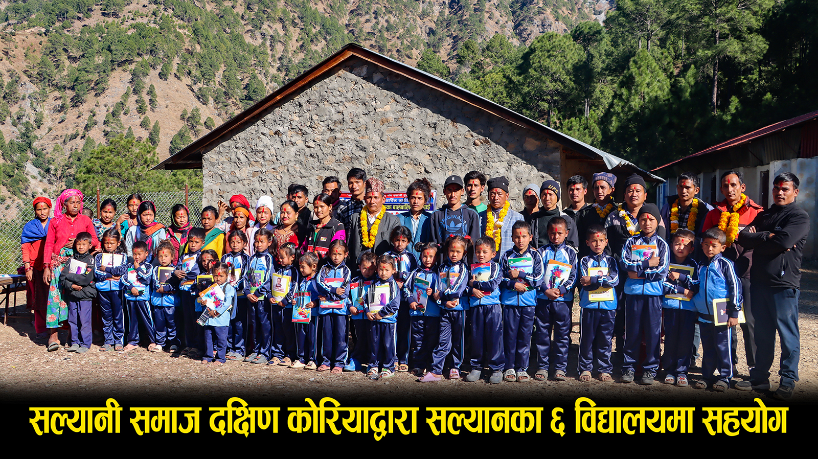 समाजले सल्यानका ४ पालिकाका ६ वटा विद्यालयका १ सय ७० जना विद्यार्थीलाइ न्यायाे कपडा सहयाेग गरेकाे सल्यानी समाज दक्षिण काेरियाका अध्यक्ष टर सिं पुनले बताए । यसरी सहयाेग पाउने विद्यालयहरुमा दिप सृजना प्रथामिक विद्यालय बनगाड कुपिण्डे नगरपालिका १० साधानबाँस, जनजोति आधारभूत विद्यालय छत्रेश्वरी गाउँपालिका १ काल्चे, महेन्द्रदोय आाधारभूत विद्यालय शारदा नगरपालिका १२ लेखडाँग्री, शिव माध्यामिक विद्यालय शा.न.पा. १२ मुल डाँडा, दुर्गा आधारभूत विद्यालय शा.न.पा. १२ तिम्ले र सरस्वति आाधारभूत विद्यालय कालिमाटी गाउँपालिका ३ फारुला सल्यान रहेका छन् ।