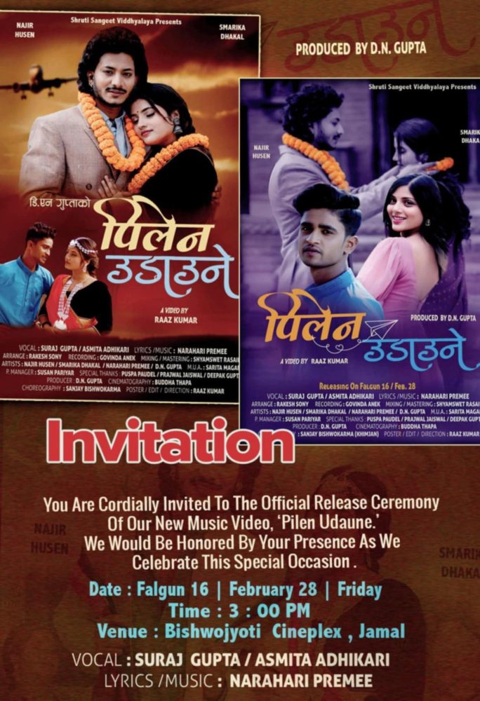 काठमान्डौं, १६ फागुन । गायक सुरज गुप्ता र गायिका अस्मिता अधिकारीको स्वरमा रहेको ‘पिलेन उडाउने’ गीतको बोलको म्यूजिक भिडियो सार्वजनिक भएको छ । डि.एन. गुप्ताले निर्माण गर्नुभएको गीतमा नरहरी प्रेमीको शब्द र संगीत रहेको छ ।