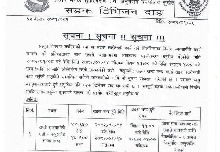 राप्ती राजमार्गकाे राम्री–कपुरकोट सडक खण्ड ७ दिन बन्द हुने