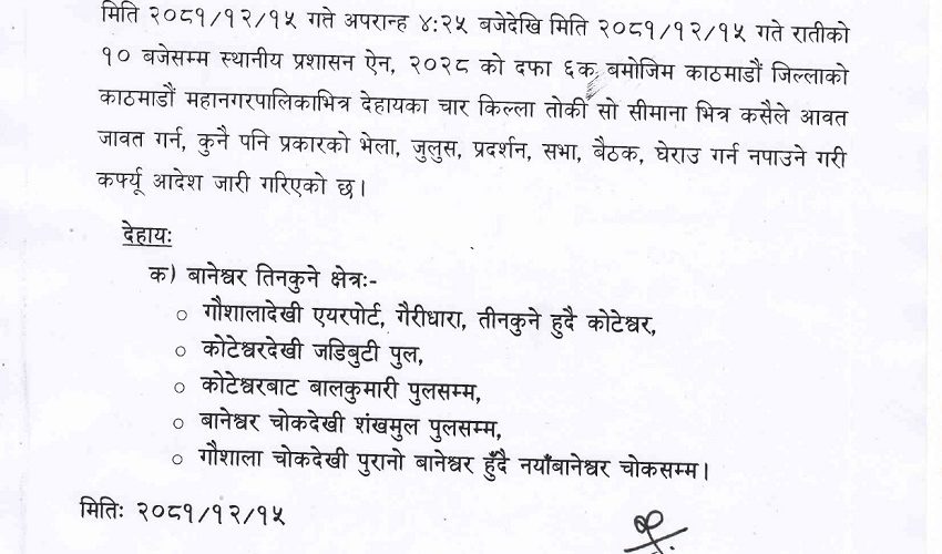 काठमान्डौंका विभिन्न स्थानमा राति १० बजेसम्म कफ्र्यू जारी