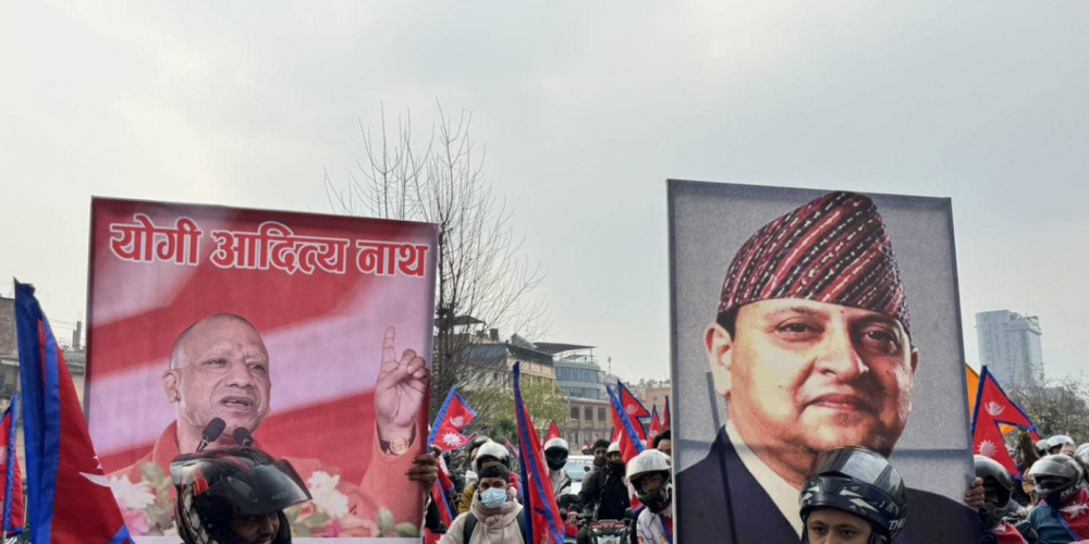 राजावादीको ¥यालीमा भारतीय नेताको ब्यानर र ज्ञानेन्द्रको फोटो बोक्दै प्रदर्शन