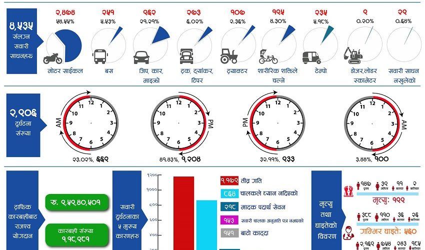 बितेको माघ महिनामा गाडी दुर्घटनामा १ सय ९९ जनाको ज्यान गयो, चार हजार ५ सय ३५ वटा गाडी दुर्घटनामा परे